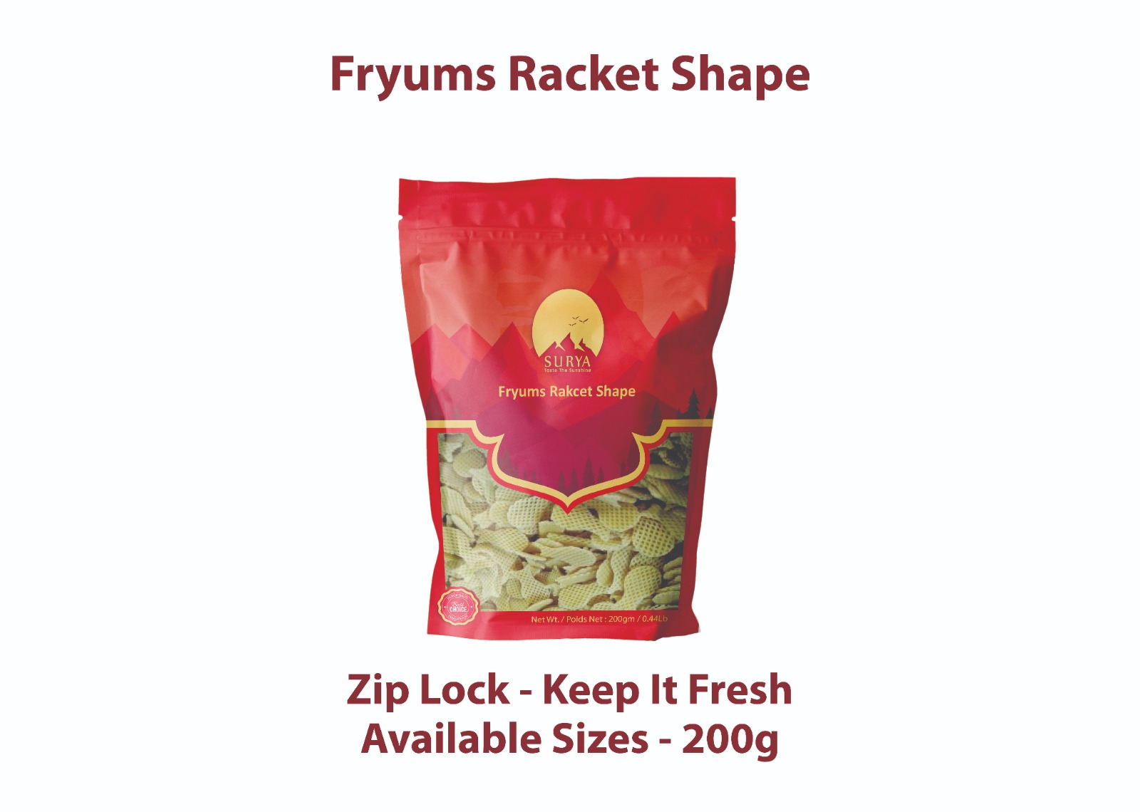 Crispy white racket-shaped fryums that puff up beautifully when fried. A fun and creative snack option for kids, parties, and everyday enjoyment. Made from quality ingredients — free from preservatives and artificial colors.